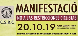 El 20 de octubre de 2019, Collserola Sin Restricciones Ciclistas (CSRC) con el apoyo de IMBA España y de muchos comercios especializados de Cataluña, Clubes ciclistas y peñas de la comarca, ha convocado una manifestación en Barcelona para reivindicar una nueva ordenación del parque de Collserola que contemple los problemas reales de la circulación de bicicletas y la convivencia dentro del mismo.