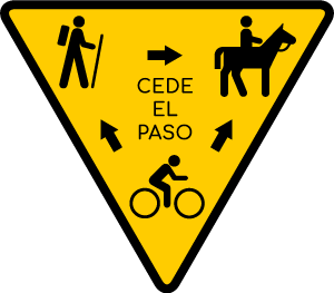 ¿Las razones? Son sencillas, al caminante se le cede el paso por educación y cultura de compartir el medio natural. Al caballista se le cede por que el caballo puede asustarse y causar un accidente. Este es nuestro triángulo de ceda el paso y lo queremos difundir entre todos los ciclistas para mejorar la convivencia en el monte.